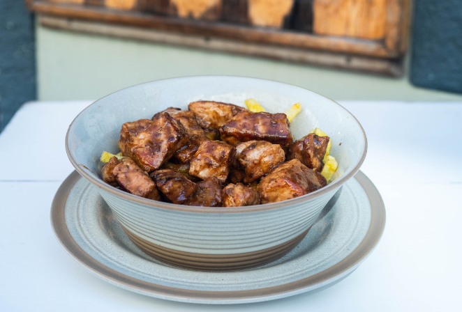 Jugosos trozos de lomo de cerdo adobado, dorados al momento y servidos con patatas
